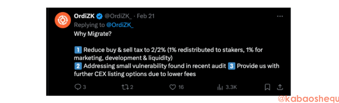 2月21日,OrdiZK通过其X账户声称,他们将把合约迁移至V2,新合约将于2月26日创建,用户可以在3月4日之前进行迁移。