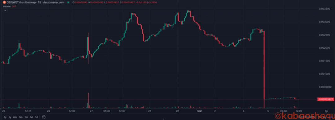 迁移截止后的3月5日,OrdiZK部署者以35.65 ETH(约13.4万美元)的价格从旧合约中出售了4.89亿个OZK,导致了高达98%的价格滑点。