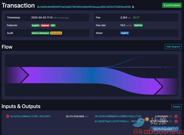Arkham Intelligence 的数据显示,2024 年 4 月 2 日,美国政府执行了一项涉及近 20 亿美元的比特币转账,分几笔将代币转移到 Coinbase Prime 地址。转账金额为 30,174.70 BTC,在区块高度 837,413 成功处理。