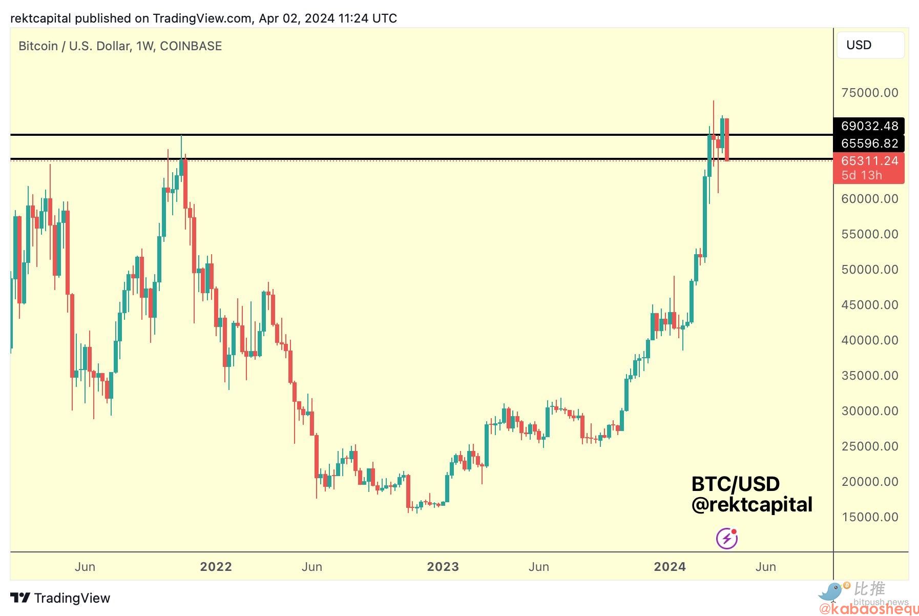 Rekt 表示:「比特币未能完成突破后的重新测试。从技术上讲,在新的每周蜡烛收盘之前,比特币仍可能恢复至约 69,000 美元的历史高点之上。」分析师补充道,比特币价格需要维持在 65,600 美元的周低点上方,以避免进一步损失。