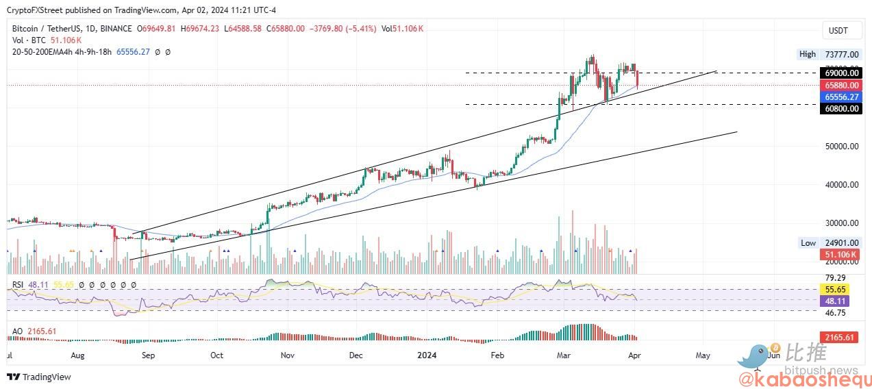 相反,如果 200 日均线保持支撑,比特币价格将反弹向上。突破 69,000 美元的支撑位将预示着更多的买单,从而增加了进一步上涨的可能性,第一个目标是收复 73,777 美元的峰值,然后才有机会在 74,000 美元区间上方创下新高。