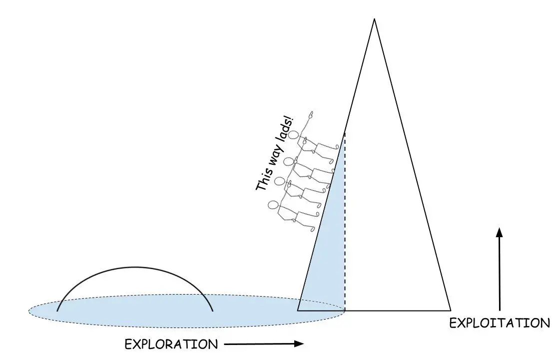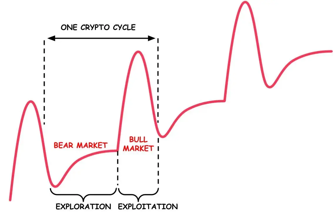 让我们简单讨论一下探索/利用的博弈论。加密周期有两个行为。一种是人们被迫想出看似新的事物,另一种是人们通过夸大的叙事来利用这些新事物。