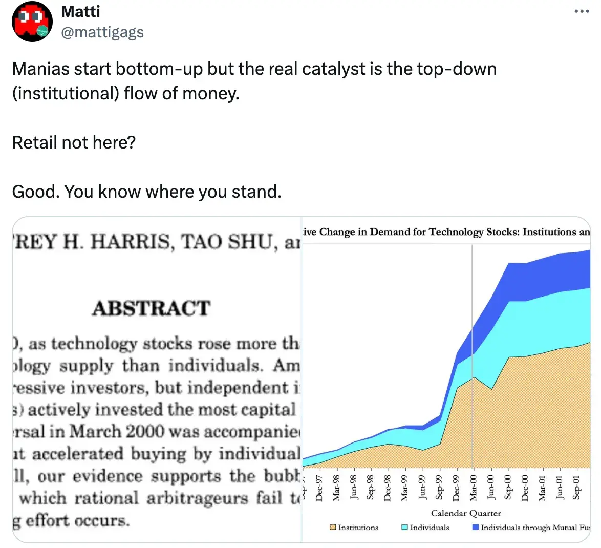 这次上涨始于机构资本的自上而下流动。没有真正闪亮的新事物。即将到来的潜在狂热的基础是机构资金流入(和信贷?)和价格走势本身。这个周期是否会因暴露于机构的过度敞口而毁灭?让我们拭目以待。